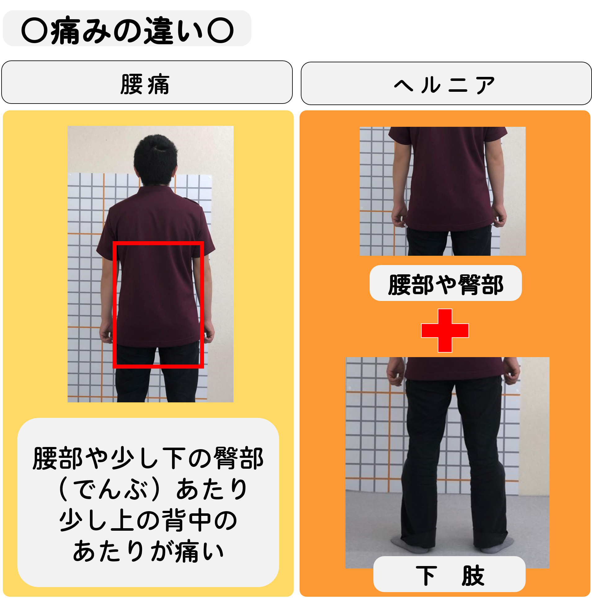 まず、痛む場所が一般的な腰痛の場合は、腰部や少し下の臀部(でんぶ)あたり、少し上の背中のあたりですが、腰椎椎間板ヘルニアの場合、腰部や臀部は同じですが、太ももや膝、足の裏などにまで痛みが出ることもよくあります。